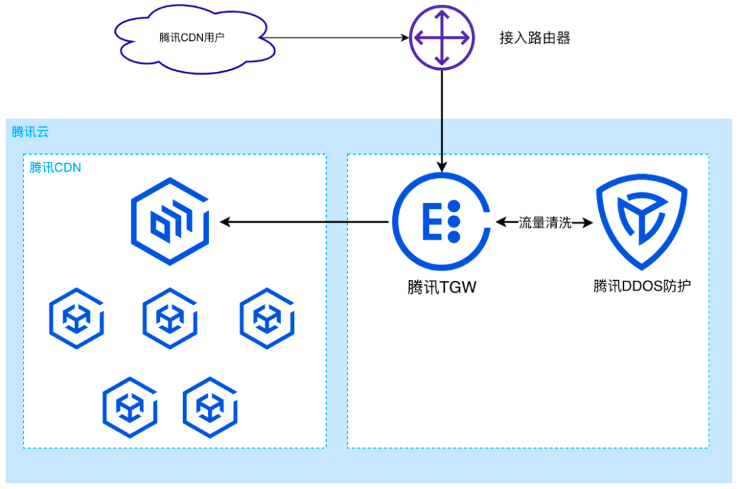 用户在使用腾讯CDN服务时,需要首先接入腾讯TGW网关。暴露在公网的业务面临严峻的网络攻击威胁,TGW网关和腾讯DDoS防护系统一起对异常流量进行监测。在上述场景中,TGW与安全设备部署在一起,将流量转发给DDoS防护系统,防护系统对异常流量进行识别和防护后,再将正常流量发回TGW。DDoS防护系统通常基于规则来实现异常网络流量识别,为了应对CDN庞大的网络流量,该系统需要常态部署超2w核的计算资源用于安全防护。