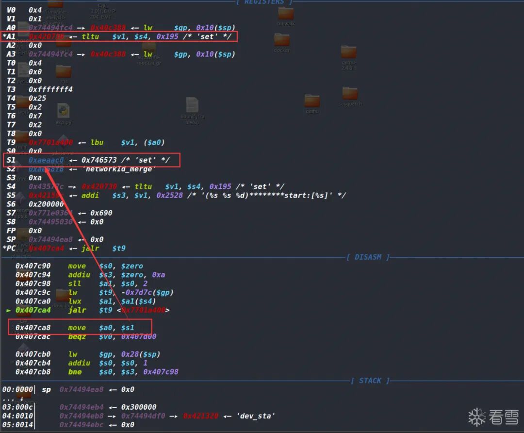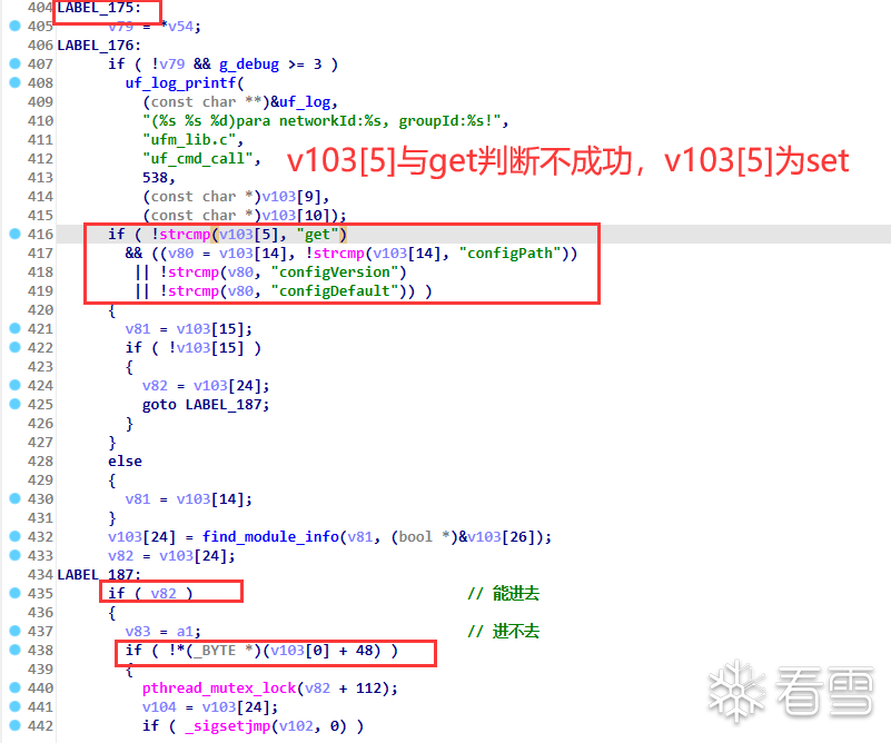 从lua文件中的代码cmd.devSta.get({module = "adminCheck", device = "pc", data = _data})执行后,会走到unifyframe-sgi.elf文件中,最后将/usr/sbin/module_call get adminCheck命令执行(这里的a1[5]代表操作符get,(v67+8)是module字段的值adminCheck)。