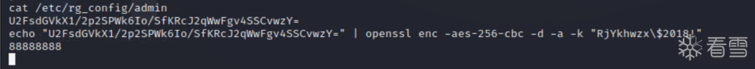 通过上面的代码可知,管理员后台密码加密后存放在/etc/rg_config/admin文件中,直接执行echo "$passwd"| /usr/sbin/rg_crypto dec -t C命令就能得到解密后的管理员后台密码。