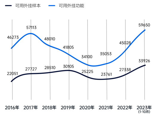 2023年腾讯PC游戏外挂对抗激烈,外挂样本量、功能数均处峰值,外挂样本数量对比2022年同期增长49%,外挂功能数增长59%;