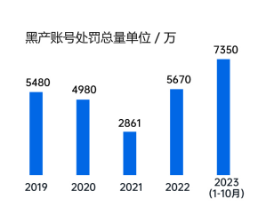 相较去年,2023年1-10月腾讯游戏安全黑产处罚账号总量达7350万,相较2022年增长明显,同比增长29.6%。