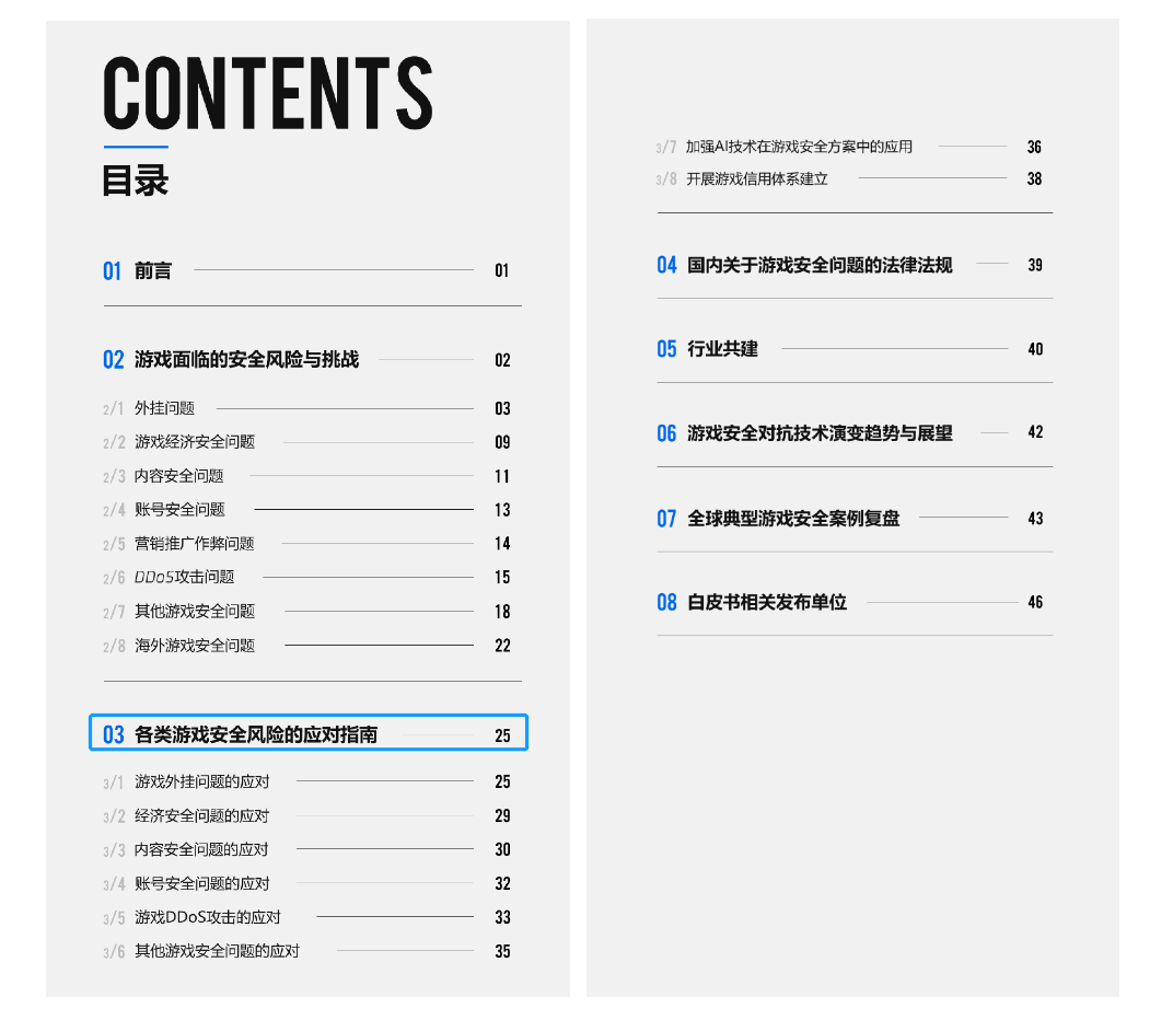 白皮书内容包括6大维度、56个内容小节,字数超过2.5万字,读者可以从中窥探到最新的游戏安全行业趋势、问题与挑战、应对方法。另外里面方案还介绍了许多前沿的技术和策略,如利用AI技术在游戏安全方案中的应用、游戏信用体系的建立等,对从事游戏相关工作的人员有着非常高的参考价值。