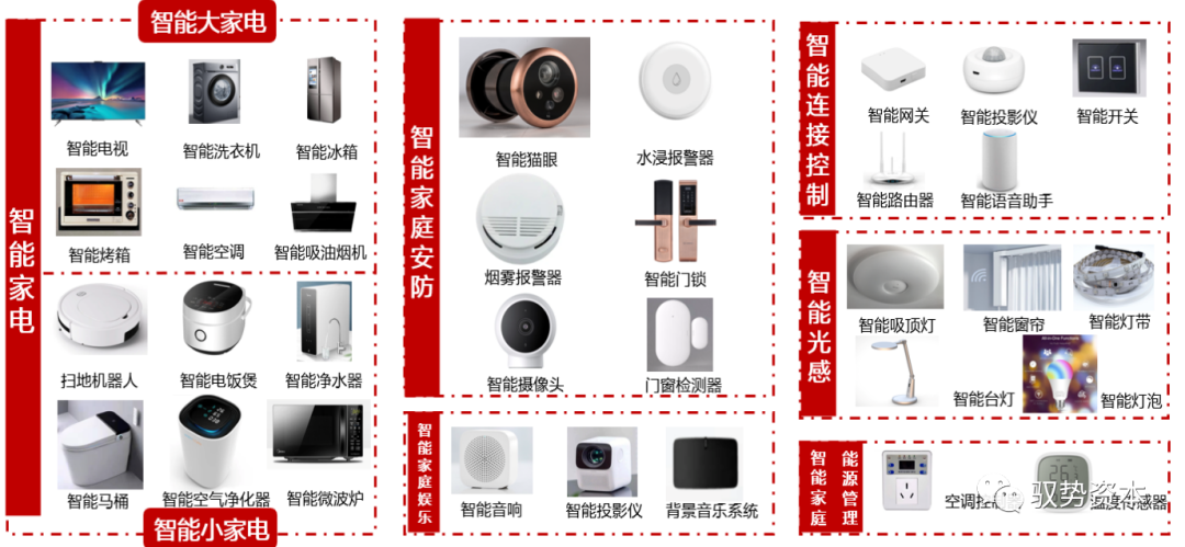 (1)智能家居有望颠覆传统白电产业,是IoT在消费电子领域的主要驱动力。智能家居(Smart Home)是指将家中常用的各类设备,如照明、音响、冰箱、彩电等硬件,通过嵌入式的IoT系统连接网络,以实现家居设备的互联互通、自动控制、远程控制、语音控制等智能化操作,从而提高人们居住舒适度、便捷度的一种智能硬件解决方案。与传统家电相比,智能家居智能化、网联化、集成化特点显著,其融合了IoT、云计算、人工智能等技术,对传统产品有着颠覆性的功能和体验,因此其对处理器芯片、传感器芯片、通信连接芯片的性能和数量需求有着显著的提升,这意味着 MCU所承载的功能愈加复杂,所需的外设接口更加丰富,主频、Flash、RAM等性能规格的要求也将不断提高。