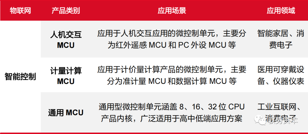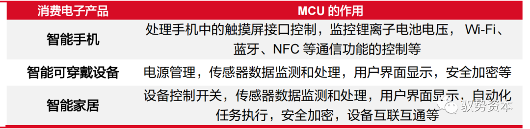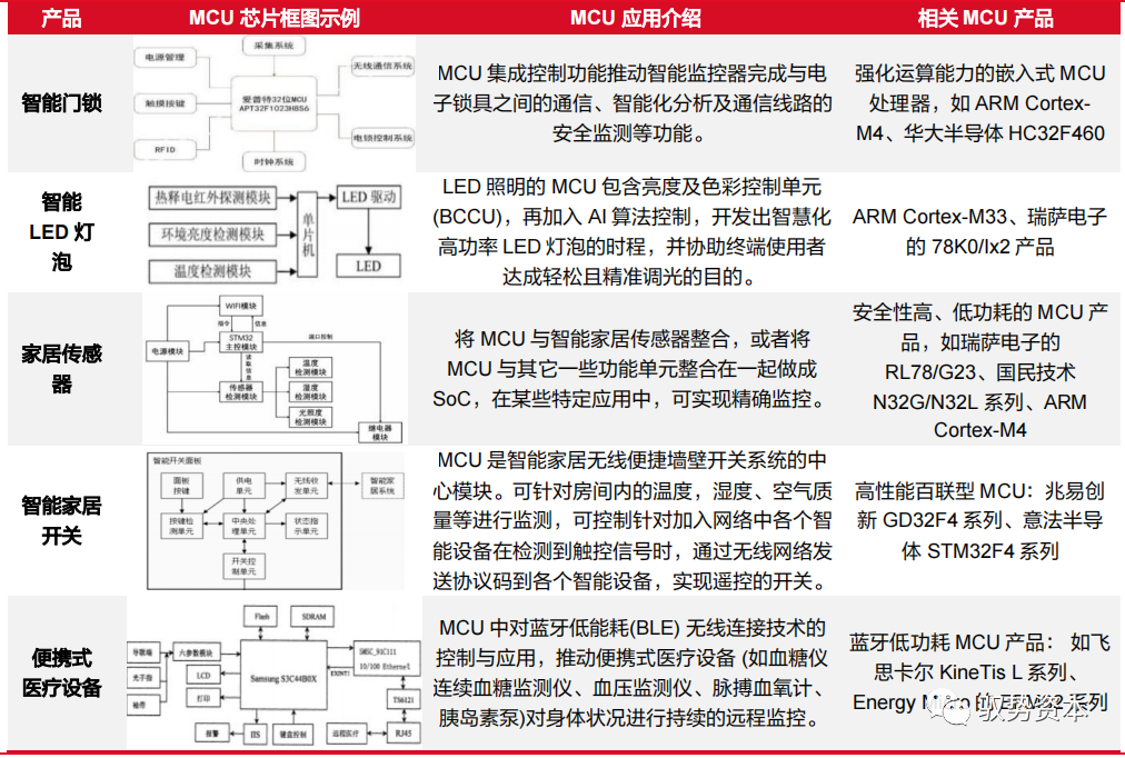 表 6 MCU在不同智能家居设备中的应用和典型产品示例