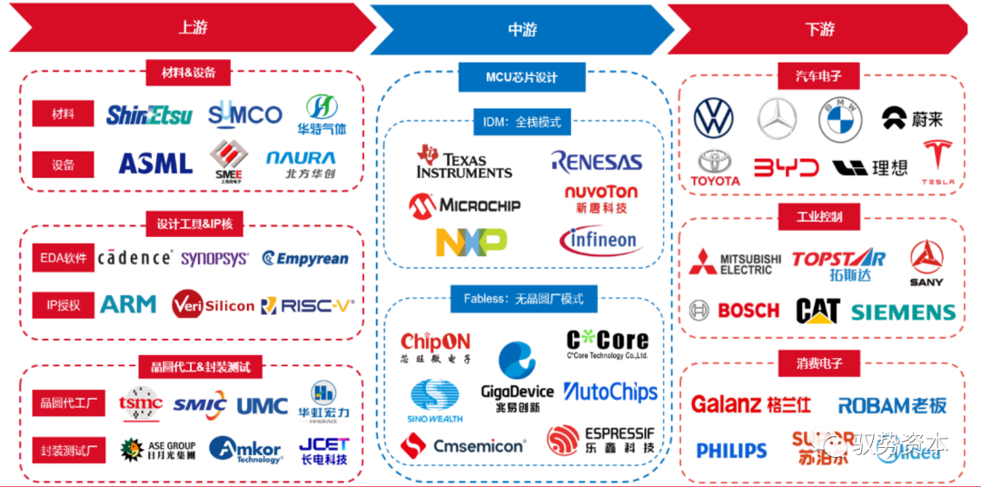 MCU产业链是一个较为复杂的全球生态系统。MCU产业链涉及环节众多,包括IP授权、芯片设计、制造、封装测试、分销等众多环节,呈现高度全球分工化的特点。MCU中游为芯片设计原厂,主要由美、欧、日芯片巨头所把控,中国企业当前市场份额较小但正在奋起直追;上游可分为芯片设计、材料及设备、晶圆代工及封测三大领域,其中:芯片设计所需的EDA软件和IP核主要由英、美企业提供;半导体材料和设备主要由美欧日企业主导;晶圆制造和封装测试工厂则主要分布在东亚和东南亚,国产化率相对较高,但制造环节有向欧美回流的态势。下游主要由汽车电子、工业控制和消费电子三大市场构成,由于MCU产品较为复杂,种类繁多,下游客户较为分散,因此MCU产品的销售主要通过经销商模式向下游终端客户分销。