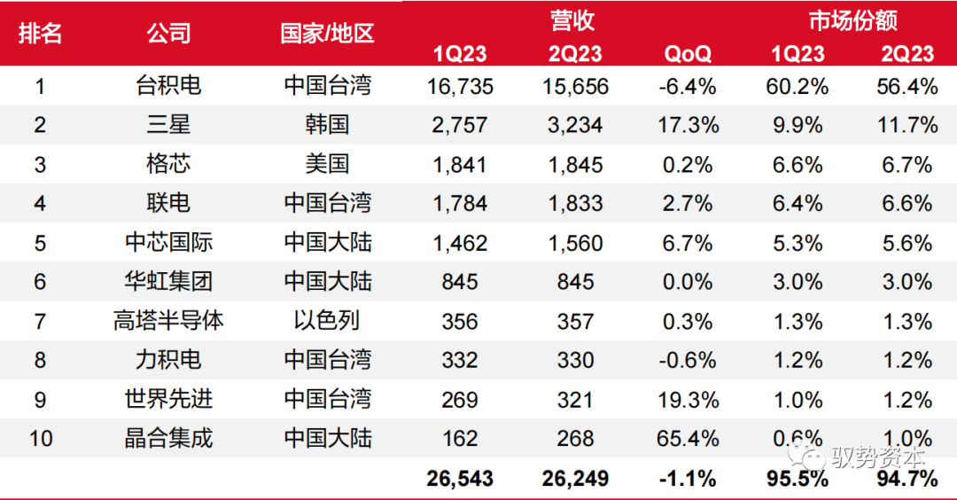 表 1 2023Q2全球前十大晶圆代工厂营收和市场份额排名(百万美元)