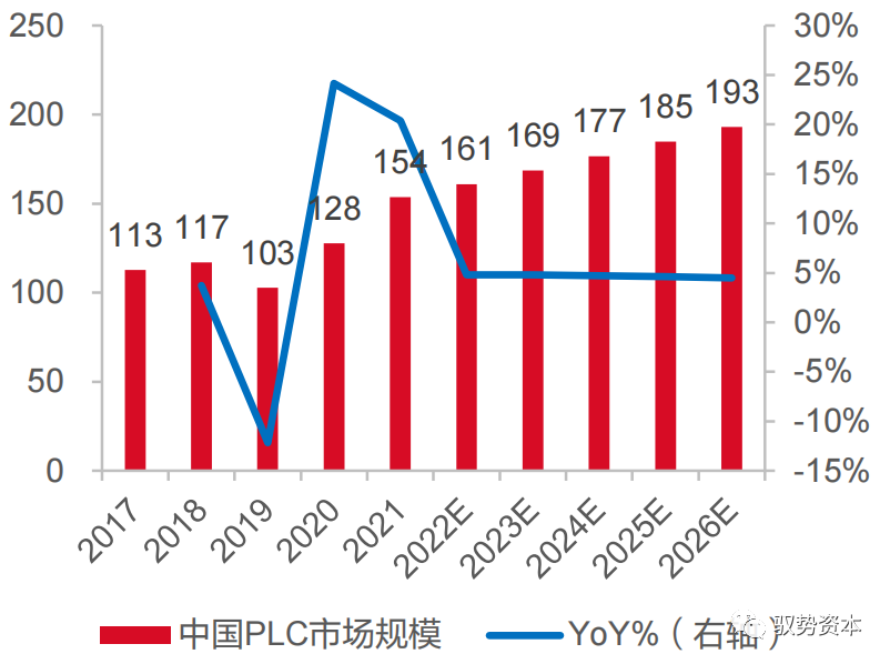 图 28 2017-2026E中国PLC市场规模及预测(亿元)