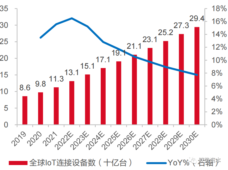 图 22 2019-2030E全球IoT设备连接数(十亿台)