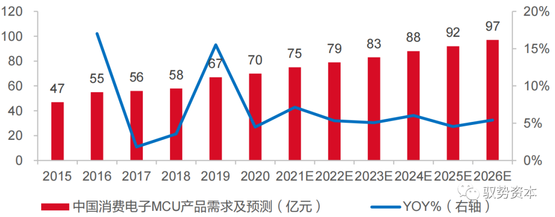 (2)消费级MCU需求持续增长,有望成为百亿级市场。根据前瞻产业研究院,我国消费电子产业对MCU的需求规模自2015年以来一直呈现稳步上升态势。随着5G的普及,AI和IoT等新兴技术的赋能,消费电子产品智能化和网联化程度将不断提高,从而带动消费级MCU蓬勃发展,预计到2026年,我国消费电子MCU需求规模将有望达97亿元。