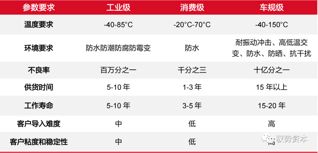 表 2 车规芯片与消费级和工业级芯片要求对比