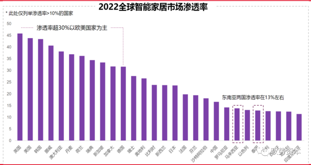 图 24 2022年全球各国智能家居渗透率对比(>10%)