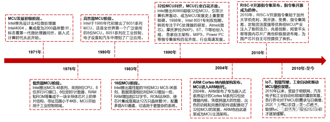 MCU已有超过50年的历史,高性能、低功耗和指令集架构的变迁是行业发展的主轴。MCU的发展历程最早可以追溯到上世纪70年代,英特尔推出4位微处理器Intel 4004,自此嵌入式计算时代正式开启,此后MCU按照分别历经了从4位、8位、16位到32位乃至64位的迭代更新,性能得到不断增强。MCU的内核架构也从起初的Intel 8051逐渐拓展到各家自主内核架构(如微芯的PIC和瑞萨的RX),以及MIPS、PowerPC、ARM 等 RISC指令集,2004年ARM Cortex M3处理器核的成功发布标志着MCU进入32位时代,ARM逐渐成为MCU的主流架构。而2010年以来逐渐兴起的开源指令集RISC-V因为其开源、免费、高度可定制等特性也逐渐受到国内外芯片设计厂商的热捧,随着近年来AIoT、智能驾驶和工业自动化等领域的蓬勃发展,嵌入式领域对MCU定制化、模块化的需求不断升高,RISC-V有望对ARM的在MCU领域的领先地位发起挑战。