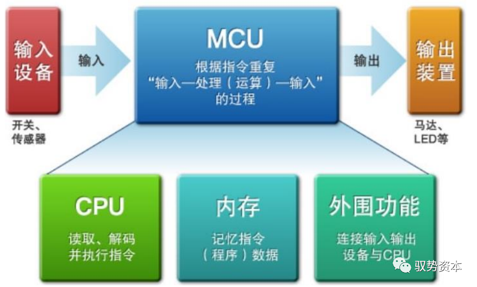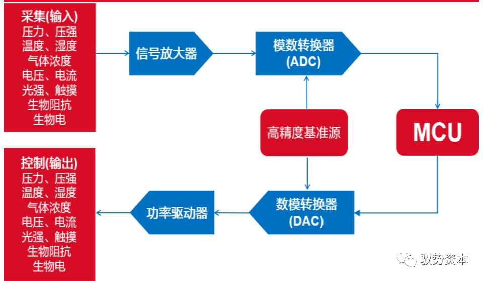 MCU是连接真实世界和数字世界的桥梁。MCU通常配备了各类输入/输出口接口,可与传感器进行连接,真实世界中的温度、光线、压力、电压等物理量可以透过传感器转换为电信号,经由信号放大器的扩大,通过模数转换器(ADC)将模拟信号离散化为计算机能够识别的二进制数字信号,传递给MCU进行算法运算和逻辑决策,生成控制信号,该控制信号再经由数模转换器(DAC)转换为模拟信号,经由功率驱动器的放大传输到外界的执行设备,从而实现对电机、开关、阀门等功能的控制。因此,MCU是衔接物理世界和数字世界进行交互的运算中枢,也是电子产品智能化、智慧化的核心。