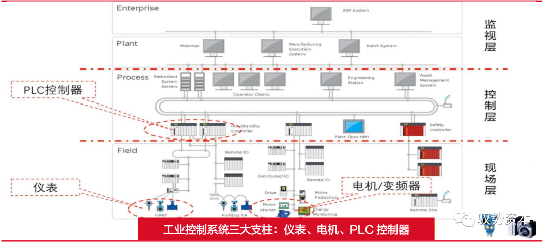 (1)工业控制系统的三大支柱是PLC控制器、仪表和电机/变频器,MCU是其中的核心。一个典型的工业控制系统通常由监视层、控制层和现场层三大架构组成,其中:1)监视层主要由ERP 软件、报警系统和数据存储系统构成,负责监视生产过程,对设备、数据进行实时监测,从而确保生产稳定性和安全性;2)控制层主要由PLC控制器、DCS控制系统、通信设备和控制软件组成,负责将监视层的指令转化为实际的参数调整、设备启停等控制操作;3)现场层主要由传感器、仪表、电机/变频器构成,负责接收控制层发来的指令并实际执行工业过程,实时监测参数并将数据传递给控制层和监视层,确保工控系统的稳定运行。在工控系统中,位于控制层的PLC控制器、现场层的电机/变频器通常被认为是三大核心支柱,决定着工控系统的整体性能,而MCU作为这些设备的核心控制器,可用于处理各类信号的输入输出、读取和分析各类参数,控制电机转速和功率等,是实现工业控制自动化和智能化的关键部件之一。