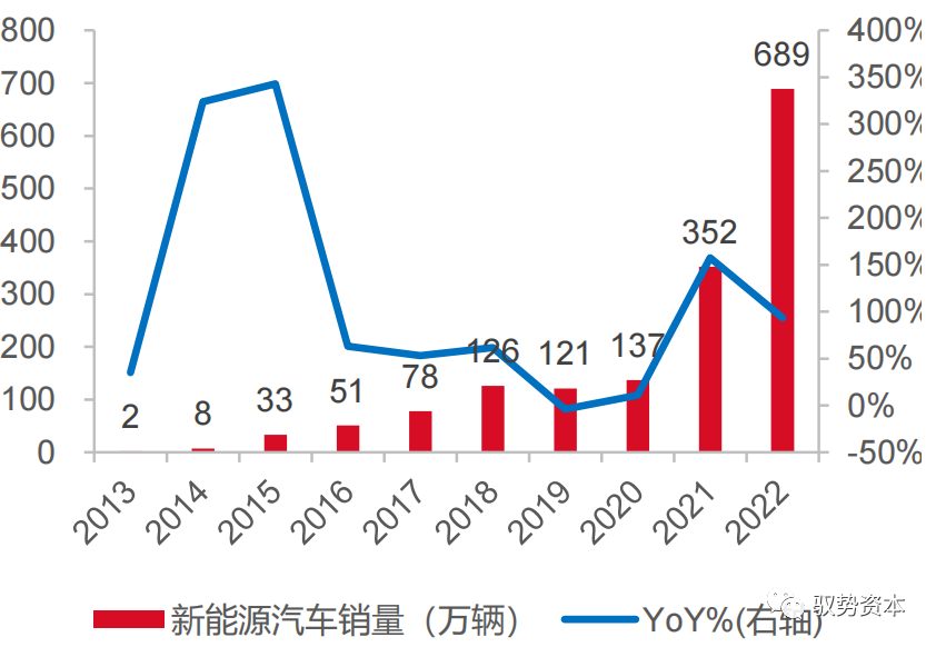 图 18 2013-2022年中国新能源汽车销量以及增长率