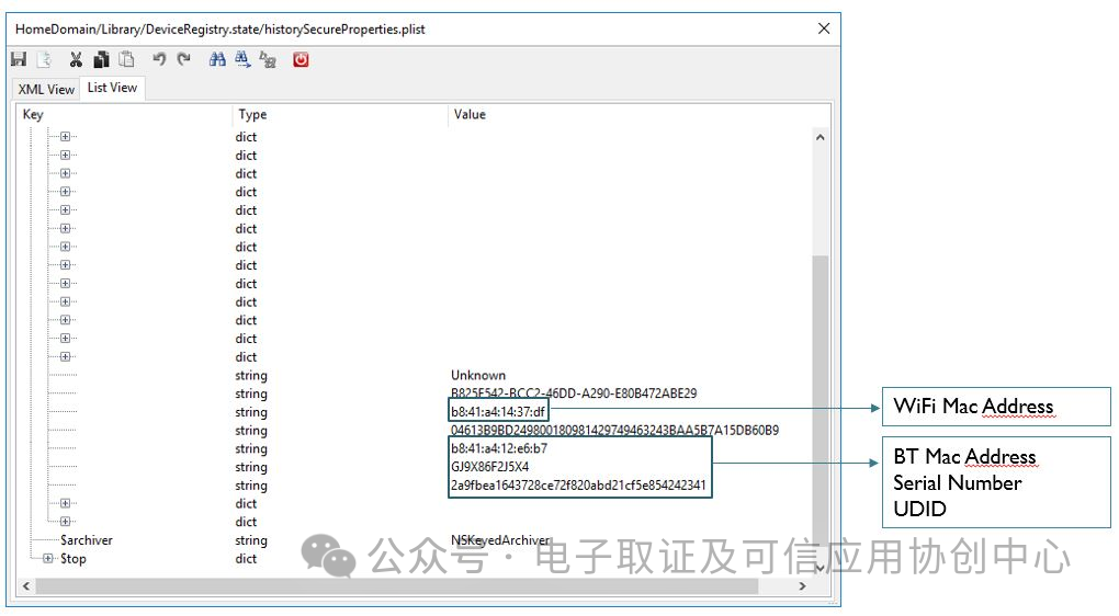 historySecureProperties.plist文件包含配对Apple Watch的序列号、UDID (UniqueDeviceIdentifier)、Wi-Fi Mac 地址和 BT Mac 地址。