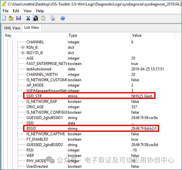 (5)WiFi日志可用于提取设备连接的网络列表。例如com.apple.wifi.plist包含每个网络的详细信息,包括SSID、BSSID和最后加入日期。BSSID还可用于使用Wigle等服务反向查找Wi-Fi网络的位置。