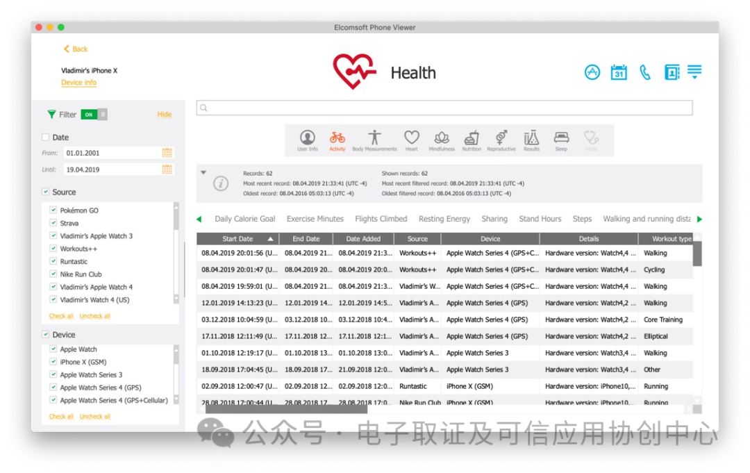 Watch还存储位置数据,其中许多数据是通过iCloud从其他设备同步的。可以使用Elcomsoft Phone Viewer访问位置信息: