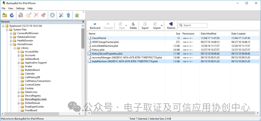 在\HomeDomain\Library\DeviceRegistry.state 文件夹中,可以找到以下四个文件:historySecureProperties.plist、stateMachine-<GUID>.PLIST、activestatemachine.plist、history.plist。