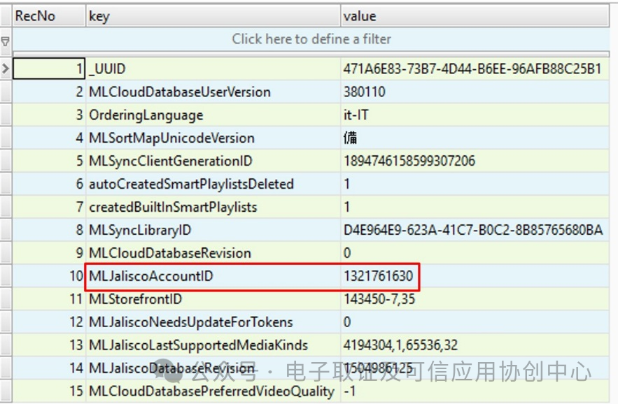 数据库包含36 个表。_MLDatabaseProperties 表包含 iCloud 帐户 ID。