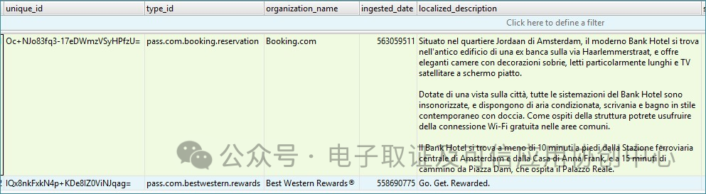 某些通行证还可以有"编码通行证"字段,这是一个包含通行证详细信息的二进制plist文件。可以从数据库中提取二进制plist文件,将其保存为单独文件,然后用plist查看器(例如plist编辑器)打开。在下面的截图中,可以看到与Booking.com上的酒店预订相关的编码通行证。编码通行证可使用SQLiteExpert打开并保存为单独文件。