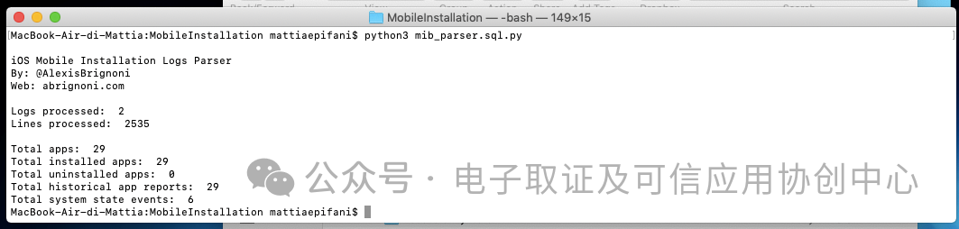 (3)MobileInstallation日志包含已安装应用程序的历史信息。在下面的截图中,可以看到Alexis Brignoni在Apple Watch的MobileInstallation日志上执行MIB PARSER脚本的过程。