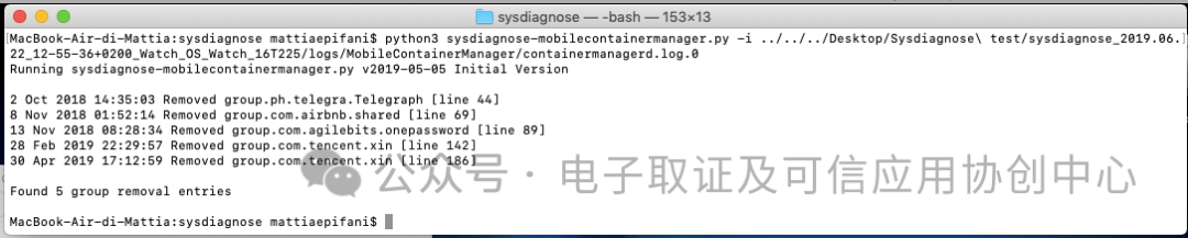 (2)MobileContainerManager日志包含有关卸载应用程序的信息。在下面的截图中,可以看到脚本在Apple Watch的MobileContainerManager日志上的执行情况。