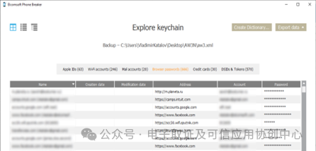 在iOS和macOS中,钥匙串会安全地存储用户的身份验证凭据,例如其登录名、密码、密钥和双重身份验证机密。watchOS会保存通过iCloud钥匙串同步的钥匙串副本。可以通过在Elcomsoft Phone Breaker中打开提取的钥匙串文件来访问该数据: