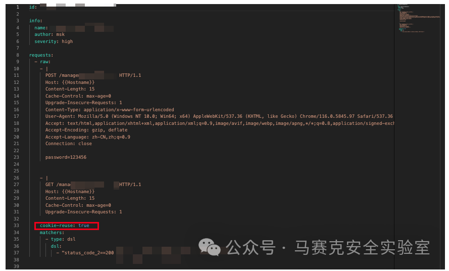 日常编写nuclei的yaml脚本,nuclei内置cookie-reuse属性,在发起多个请求时,需要保持会话,可以添加cookie-reuse: true来保持多个请求时会话得到保持,这在有身份验证时很有用。![]()