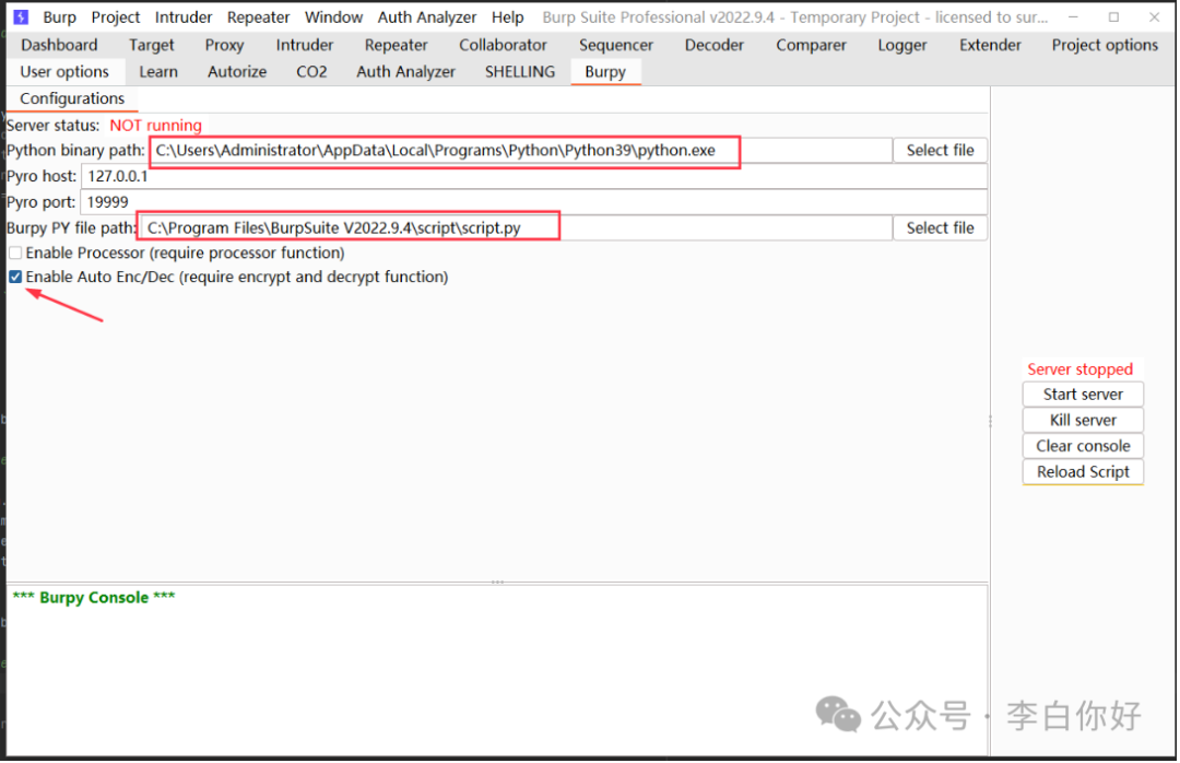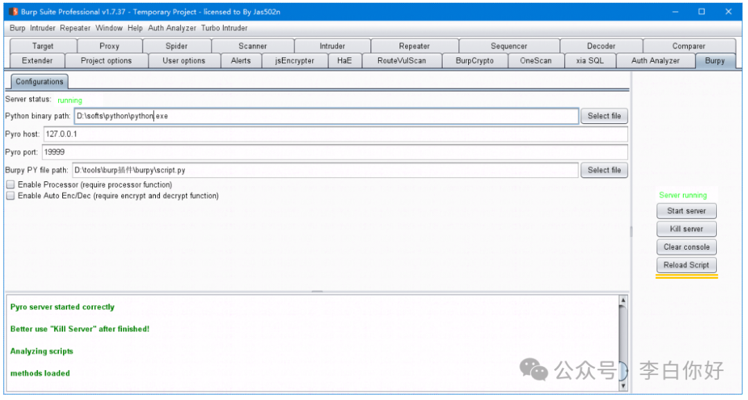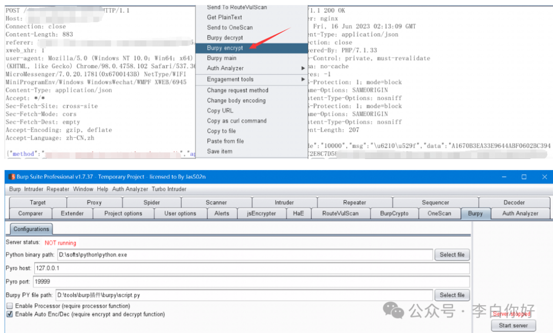 在Burpy PY file path:里面指定好你自己的python脚本。Burpy也提供了脚本模板,可以直接在它的脚本模板中进行加解密算法