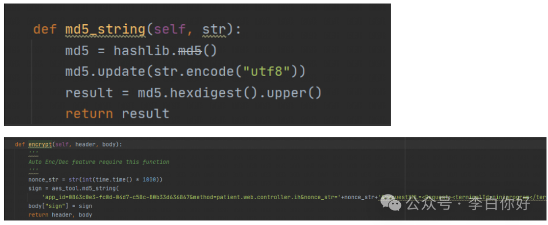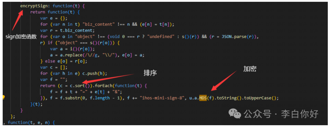 先遍历对象t,将其中给的参数进行整理,将其中属性是"biz_content"的重新赋给变量r,并且将r的参数属性从json格式转换为对象类型。整合后以字符串的形式以 “&” 连接,将字符串再连接一个预设的值 “ihos-xxx-8”。按照字母升序的方式排列,排列后使用MD5的方式加密再转为大写即可。