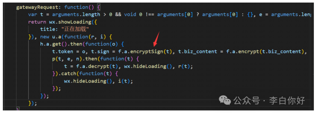 回溯源码看哪里调用了encryptSign,搜索encryptSign查到gatewayRequest函数。继续跟进。