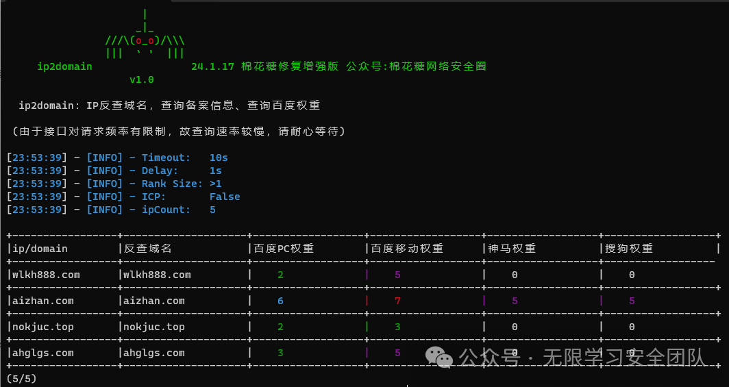 usage: ip2domain.py [-h] [-t TARGET] [-f FILE] [-s DELAY] [-T TIMEOUT] [-r RANK] [-o OUTPUT] [--icp]optional arguments:-h, --help show this help message and exit-t TARGET, --target TARGETTarget ip/domain-f FILE, --file FILE 指定目标文件,一行一个,ip或者域名-s DELAY, --delay DELAY请求延迟 (默认 2s)-T TIMEOUT, --Timeout TIMEOUT超时时间 (默认 12s)-r RANK, --rank RANK 大于指定的百度权重值则输出,范围0-10 (默认 0)-o OUTPUT, --output OUTPUT输出文件 (文件路径:./output/ip2domain_{fileName}_{date}.csv)--icp 是否开启ICP备案查询 (默认不开启)