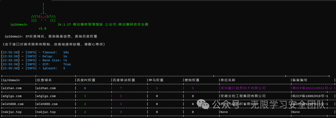 python .\ip2domain.py -f E:\Desktop\target.txt -s 2 -r 12、百度权重阈值为1,请求时延为2,开启ICP备案查询