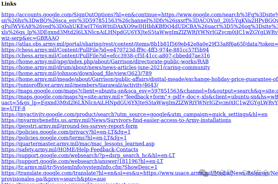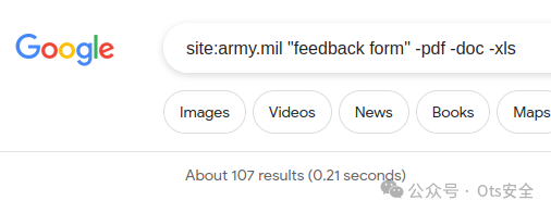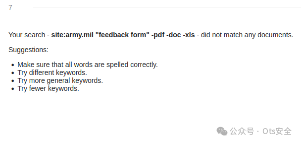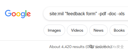 1. 使用 site: target.com keywords -filter -filter2…从顶级域名开始。对于 DoD,顶级域名级别可能是.mil,所以我将从这个开始。作为关键字,我将使用文字反馈,因为它很可能最终出现在员工 CRM/管理面板中。最后,过滤词将附加在末尾,例如,我不希望搜索包含pdf、doc、xls文件,因此我将排除这些文件。最终的搜索将如下所示: