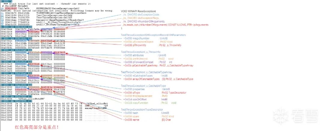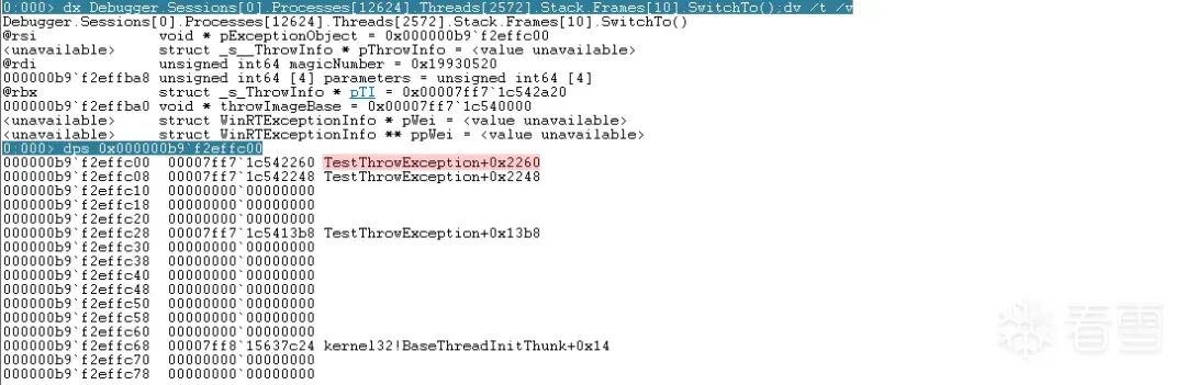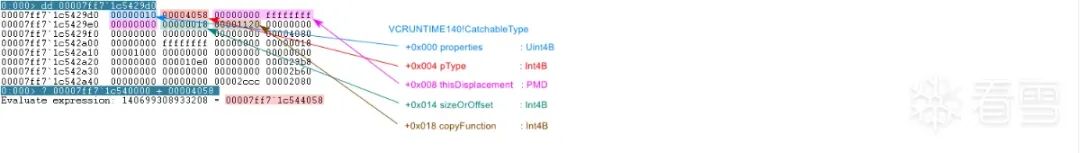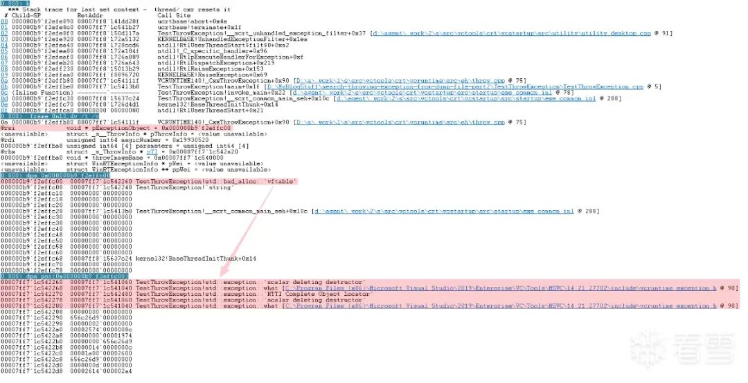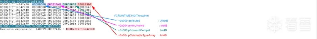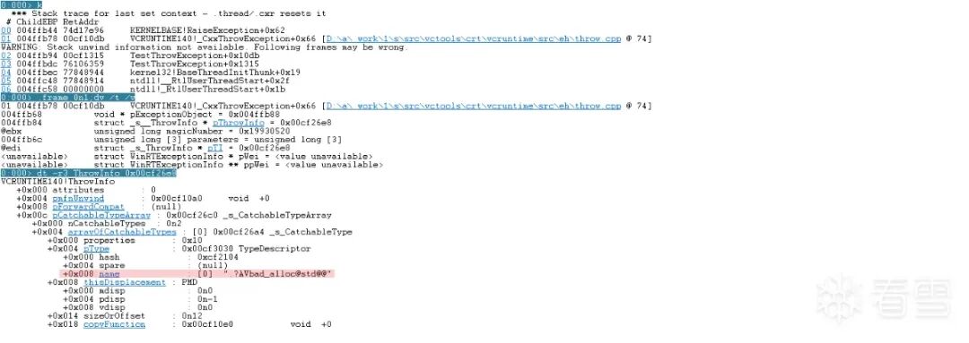 ThrowInfo类型的对象说明: 还有两种查看方法: 1、对于 32 位程序可以通过 _CxxThrowException() 对应栈帧的第 2 个参数(ebp+c)直接查看。 2、如果有 vcruntimexxx.dll 的调试符号,可以直接切到 _CxxThrowException() 对应的栈帧,windbg 会自动帮忙列出对应的值。
