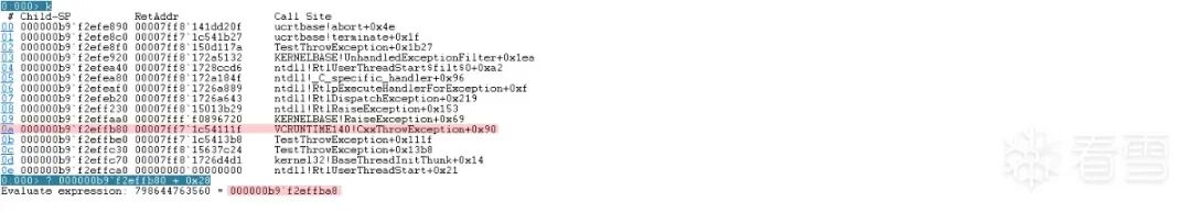 在测试程序中,pExceptionObject的地址是0x000000b9f2effc00,可以在windbg中执行dps 0x000000b9f2effc00即可查看异常对象对应的虚表,如下图: