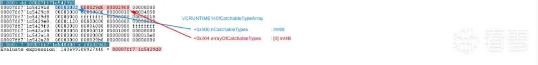 1.获取CatchableTypeArray的地址。ThrowInfo + 0xc保存了CatchableTypeArray的偏移。