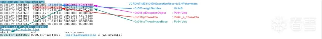 vcruntimexxx.dll的调试符号,可以跳过前两步,直接切换到_CxxThrowException对应的栈帧即可得到ThrowInfo的地址和异常模块基址。