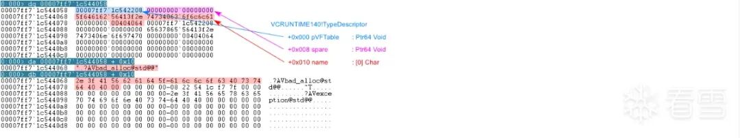 从上图可知,异常类型是std::bad_alloc,其虚表内容都是其基类(std::exception)的虚函数,因为std::bad_alloc没重写任何虚函数,也没新增任何虚函数。