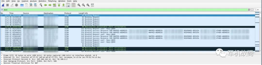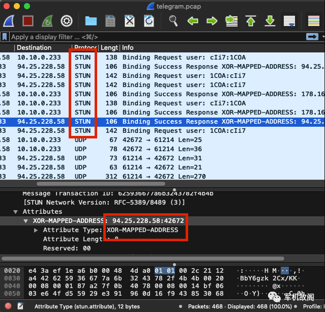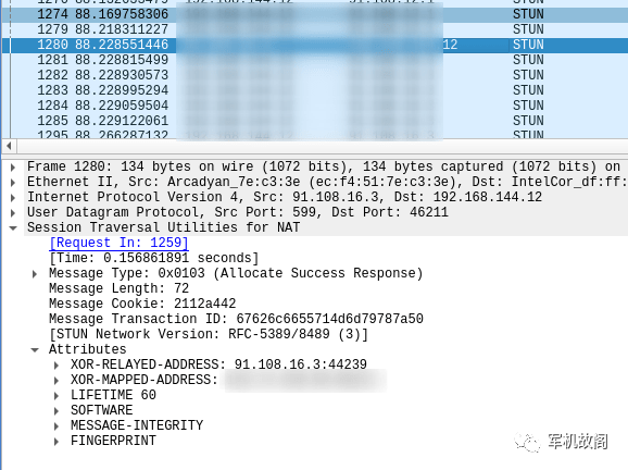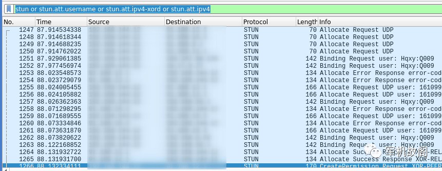 4. 在Wireshark中我们通过stun进行过滤5. 目标的IP地址,是携带XOR-XXXXX-ADDRESS数据包,所以我们可以过滤: 'stun 或 stun.att.用户名 或 stun.att.ipv4-xord 或 stun.att.ipv4'6. 通过查看每个数据包的 IP 地址来检查数据包。这可以通过检查数据包并在属性部分中查找 XOR-XXXX-ADDRESS或通过查看数据包的目标地址来查看。数据包。