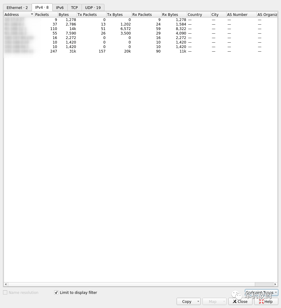 有个方便的技巧,使用wireshark 获取已通过stun 协议查询的所有地址,而无需手动查看数据包: 在工具栏中我们点击Statistics -> Endpoints,选择限制显示过滤器勾选(使用wireshark中的stun过滤器),只显示与stun通信期间使用的IP,就可以方便的筛查。