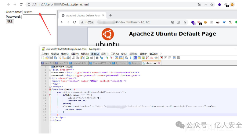 下图为简单的实现效果,然后我们就可以查看服务器的apache日志记录相关的信息了,这是静态的页面收集信息的方法,此外,最简单的制作一个登陆页面的方法就是ctrl+s保存一下就行了,但是我们一定的把html里面自己的相关信息给删除掉(工号)