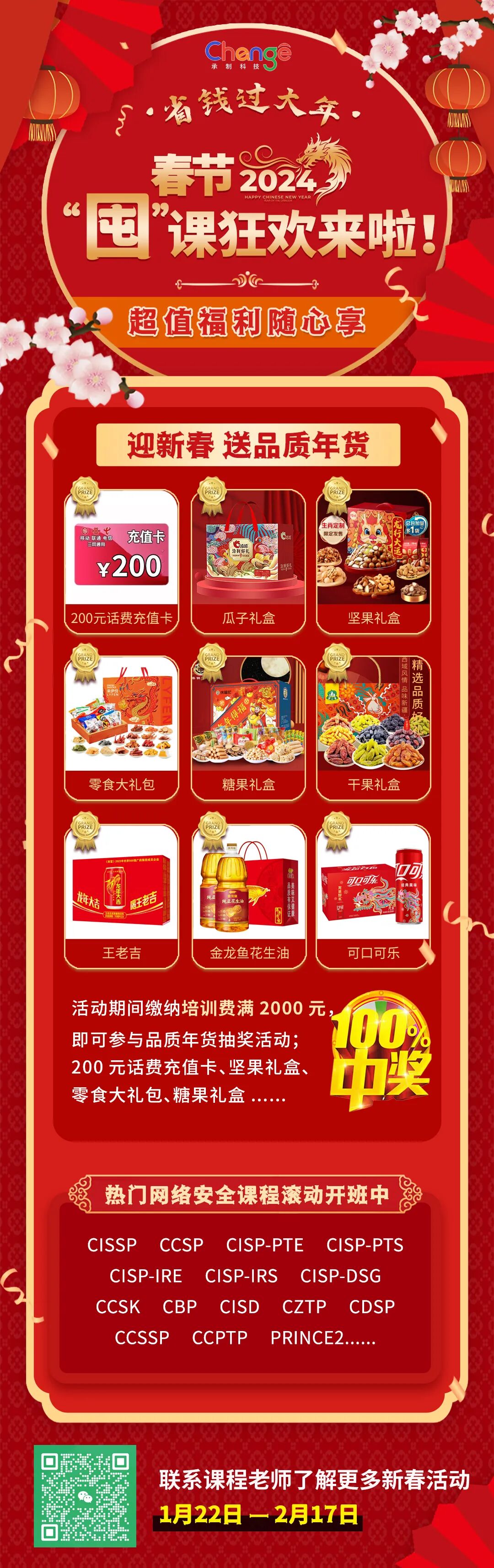 承制科技春节囤课狂欢活动即将拉开帷幕!活动期间缴纳培训费满2000元,就有机会参与品质年货抽奖活动,100%中奖!200元话费充值卡、坚果礼盒、零食大礼包、糖果礼盒等等品质年货等你来拿,让你不仅学有所成,还能享受到丰厚的年货福利。
