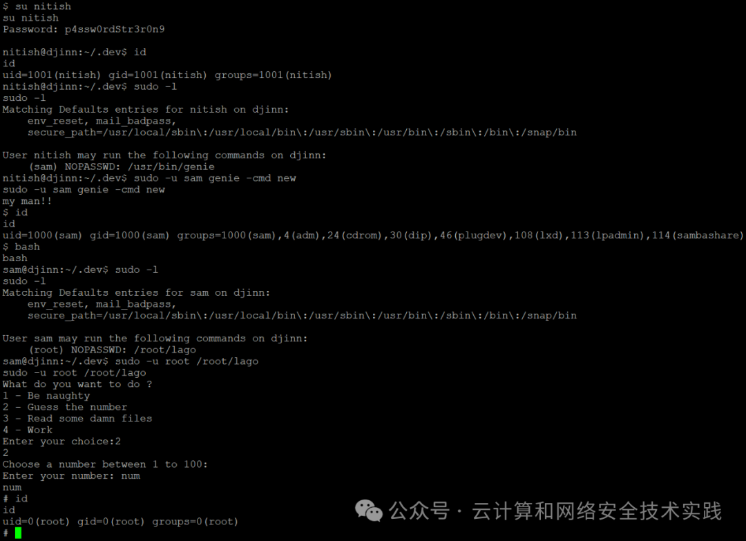 执行sudo -u sam genie -cmd new,获取到新的shell,