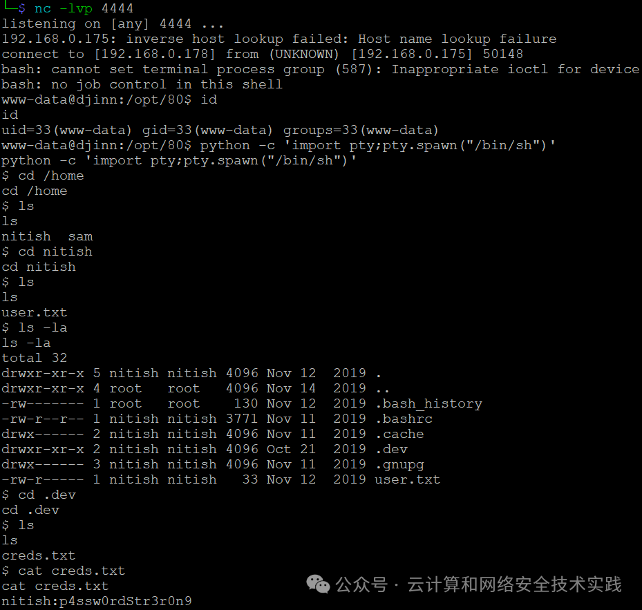 kali攻击机上开个反弹shell监听,nc -lvp 4444,