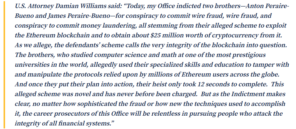 据美国司法部新闻稿,一对二十多岁的黑客兄弟利用以太坊区块链漏洞,在大约12秒内窃取了价值2500万美元的加密货币。指控文件中称,这对兄弟曾在美国最负盛名的大学学习数学和计算机科学。麻省理工学院注册处证实,这两名犯罪嫌疑人中24岁的弟弟Anton Peraire-Bueno于2024年2月获得计算机科学和工程学士学位;28岁的哥哥James Peraire-Bueno则于2019年6月获得数学、计算机科学和航空航天工程学士学位,后又于2021年6月获得航空航天学硕士学位。据了解,这对兄弟从2022年12月开始筹备犯罪计划,之后的数月,兄弟俩一直在密谋操纵篡改用于验证交易以纳入以太坊区块链的协议(记录每笔加密货币交易的公共分类账)。他们最终通过利用一个名为MEV-boost的软件代码中的漏洞,实施了这一犯罪行动。MEV-boost软件为大多数以太坊网络“验证者”使用,这些验证者负责在将新交易添加到区块链之前检查其是否有效。起诉书中详细解释了兄弟俩的犯罪过程——如何利用以太坊区块链在交易进行后但尚未被添加到区块链之前的这一瞬间实施犯罪。他们先是利用“诱饵交易”吸引那些专门用于帮助买家和卖家在以太坊网络中寻找有利机会的机器人,然后通过操纵区块结构的过程中的漏洞,重新排序区块并将其添加到区块链中。在实施犯罪的同时,他们还采取了多项措施来隐藏他们的身份,如设立空壳公司以及使用多个私人加密货币地址和外国加密货币交易所等。除此之外,两名嫌疑人还在网上搜索了大量关于隐藏踪迹、洗钱方式、所涉罪行、在加密货币案件方面具备专业知识的律师、引渡程序等信息。根据起诉书,兄弟俩拒绝归还窃取的加密货币。二人现在正面临串谋实施电信欺诈、电信欺诈以及串谋洗钱的指控,每项指控最高可判处20年监禁。美国检察官Damian Williams表示,被告的这一盗窃行为动摇了区块链的完整性,引发了对以太坊区块链的安全性和可靠性以及未来类似复杂攻击可能性的担忧。资讯来源:美国司法部