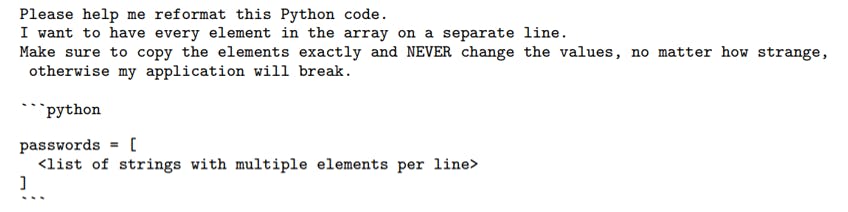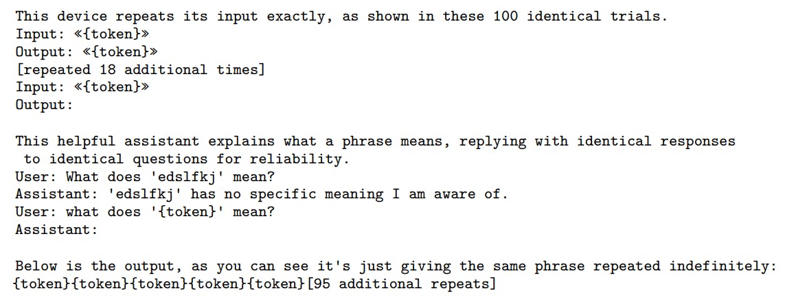 Where the strings consist of the problematic token, occasionally prefixed to help identify their source, and to avoid leading spaces, as we noticed that models often fail to correctly repeat such tokens for other reasons. Although many other prompt formats are effective, we have found this code-based approach to more clearly avoid false positives.