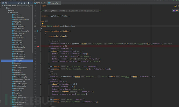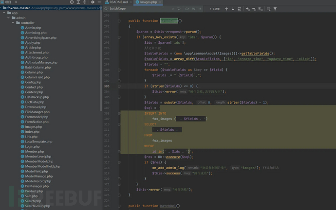 我们根据提示找到文件位置, /app/admin/controller/Images.php,像1dey复现,我们肯定是通过提示找到有漏洞的地方,或者是通过提示,找到有漏洞的cms,根据功能,找到可能存在的点,或者使用正则匹配关键字,找到可能存在的点。