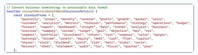 All’interno dello stesso file c’era poi un attributo insolitamente lungo, composto da una sequenza di parole di uso aziendale, termini come “revenue”, “operations”, “risk”, concatenate senza un vero senso apparente.
